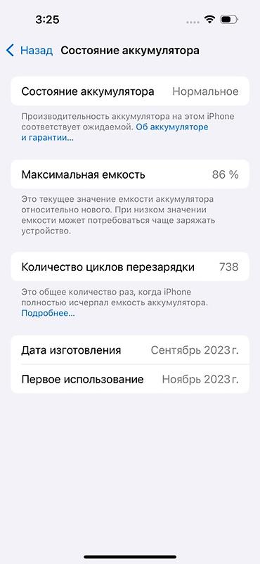 - Количество циклов перезарядки: 738