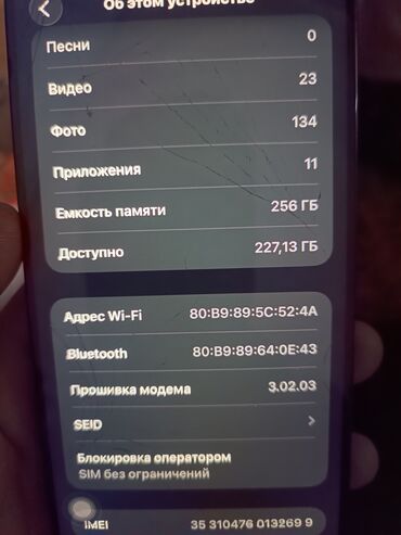 - Память: 256 ГБ, доступно ~227 ГБ.