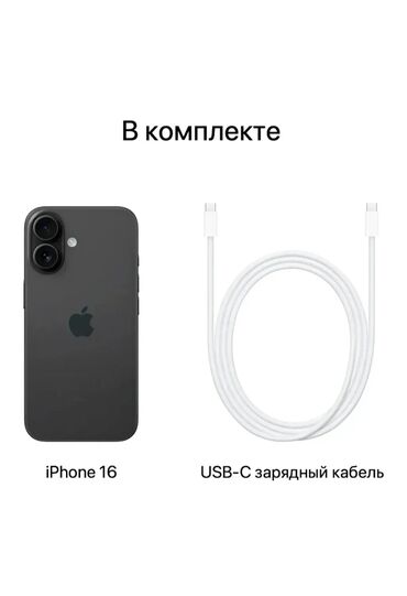 - В комплекте: iPhone 16 и зарядный кабель USB‑C (указано на изображении).