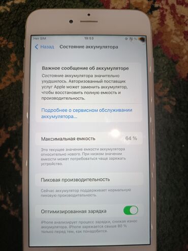 - Состояние аккумулятора по меню: максимальная ёмкость 64%, есть уведомление о необходимости сервисного обслуживания; «Оптимизированная зарядка» включена