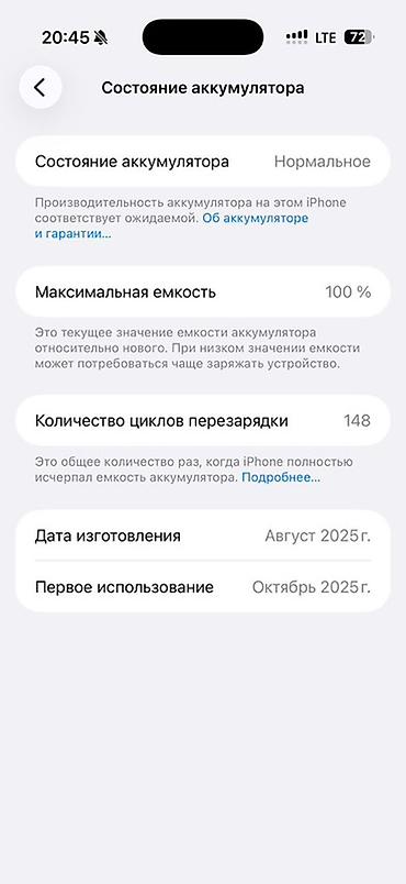 - На скриншоте из меню аккумулятора: максимальная ёмкость 100%, количество циклов перезарядки 148.