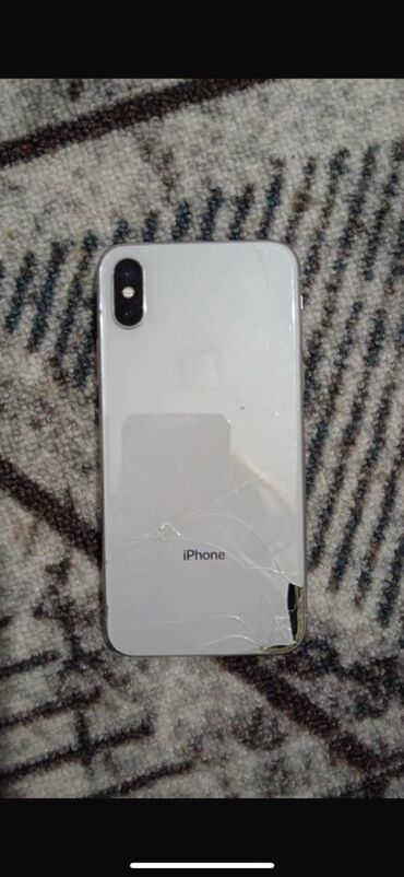 IPhone X, 5.8", серебристый корпус (стеклянная задняя крышка, стальные рамки). Особенности по фото: - Задняя крышка из стекла с трещинами, особенно в правом верхнем углу. - Рамка по периметру со с...