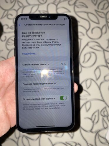 - Состояние аккумулятора по iOS: максимальная емкость 75%; отображается уведомление «Не удается проверить подлинность аккумулятора Apple» (аккумулятор может быть заменен неоригинальным)