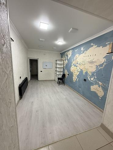 - Отделка: светлый ламинат в основном помещении и коридоре, плитка в дополнительной комнате; стены под покраску/декор, одна акцентная стена с большой картой мира.