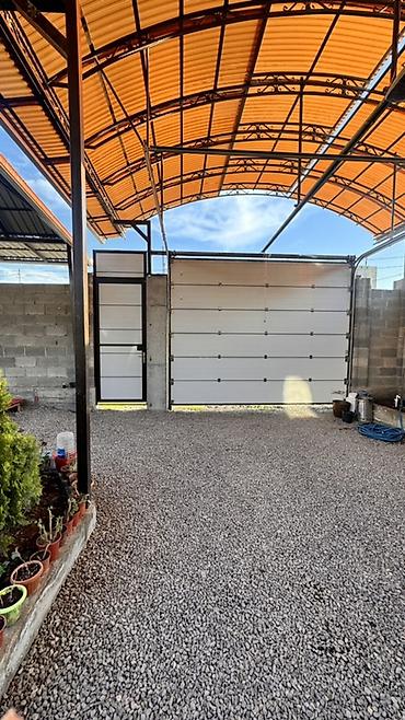 - Просторный навес из профнастила на кованом металлическом каркасе — защищает въезд и парковку на несколько автомобилей.