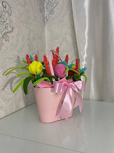 Авторский букет декоративных цветов из пушистых трубочек (проволочных «чистиков»). - Ручная работа: каждый лепесток сформирован и прошит из мягких трубочек, сердцевины — декоративные тычинки. - ...