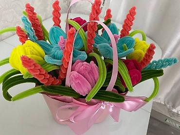 - Авторский букет: тюльпаны, соцветия и листья, скрученные из мягкой плюшевой проволоки.
