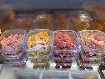 Сублимированные фрукты в прозрачных пластиковых контейнерах. На рынке