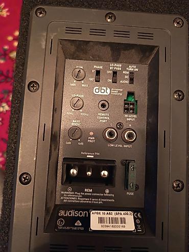 Дополнительно на фото: активный сабвуфер Audison APBX 10 AS2 (панель управления с входами RCA/Hi‑Level, фазой, LP‑фильтром 50–300 Гц, Bass Boost, автоснятие/включение, порт для дистанционного управления, предохранитель).
