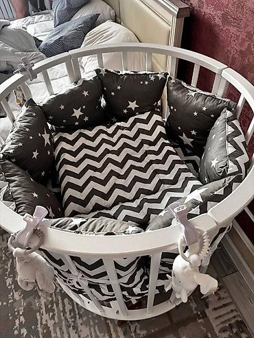 Готова к использованию: собранная кроватка с текстильным комплектом и игрушками, как на фото. Цвет универсальный — подойдёт к любому интерьеру детской.
