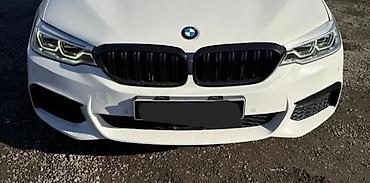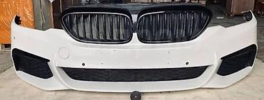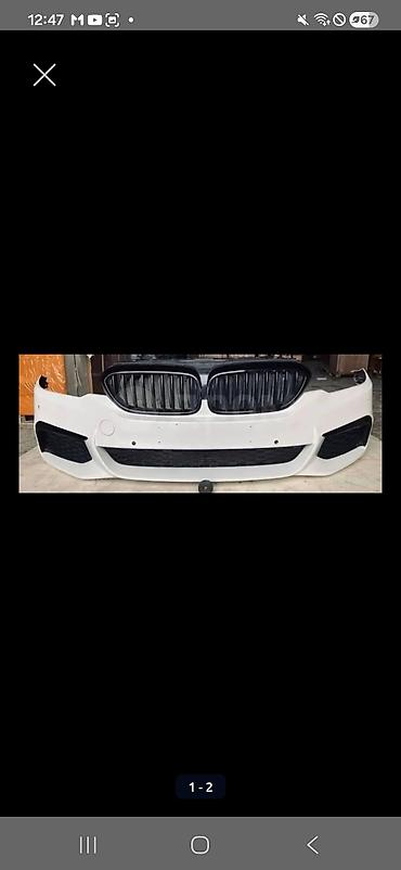 Передний бампер для автомобилей BMW G30 и G31, выполненный в белом цвете. В комплекте с бампером поставляется черная решетка радиатора с вертикальными ламелями. Бампер оснащен отверстиями для датчиков парковки и местами для установки противотуманных фар, что обеспечивает полную функциональность. Изготовлен из прочного пластика, предназначен для замены поврежденного или обновления внешнего вида автомобиля.