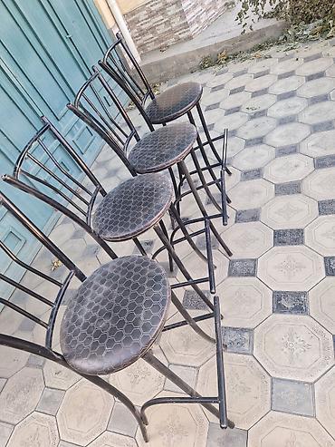 - Стулья: 4 высоких барных стула на металлическом основании с подножкой-упором. Спинка с вертикальными прутьями. Круглое сиденье с обивкой под кожу с геометрическим тиснением (шестигранник).