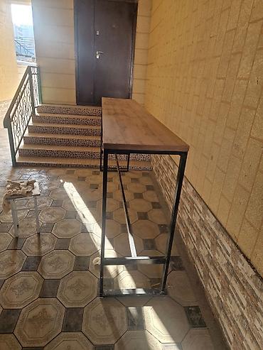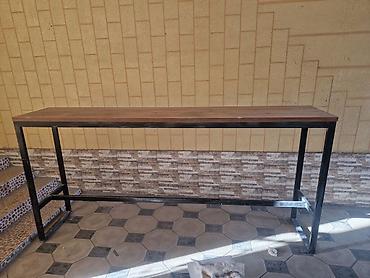 - Стол: прямоугольная барная стойка на металлическом каркасе. Столешница из древесины с натуральной текстурой, толщина визуально массивная, поверхность ровная. Каркас из профтрубы с поперечными усилителями по низу для жёсткости и устойчивости. Узкий и длинный формат — удобно вдоль стены, в зоне кухни или кафе.