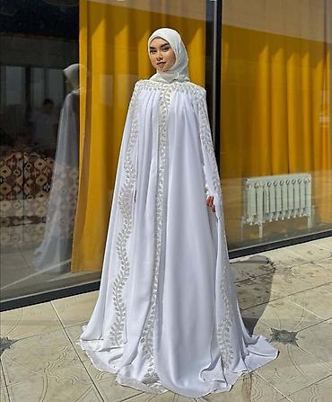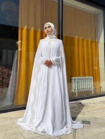 Белое нарядное свадебное абайя-платье с накидкой-капой