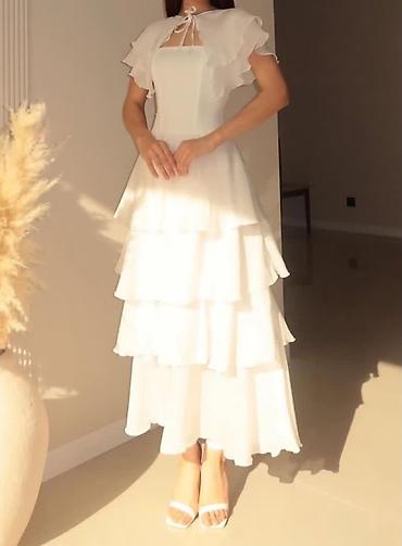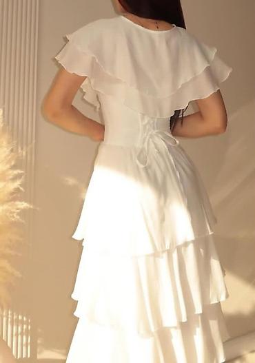 - Ткань: легкая, полупрозрачная на воланах, струящаяся; визуально держит форму ярусов.
