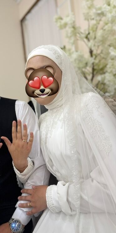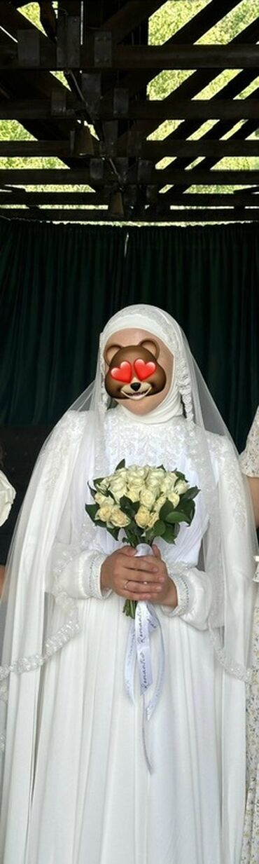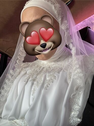 Белое свадебное платье с длинными рукавами и высоким воротником, украшенное вышивкой бисером и бусинами. Размер: подходит М,L,XL. Платье имеет силуэт А-линии с широкой юбкой и прикрепленным шлейфом, который можно использовать как накидку. Длинные рукава с манжетами декорированы бисером. Модель дополнена фатой из тюля, также украшенной бисером по краю. Этот наряд подходит для торжественных мероприятий и создает элегантный образ.