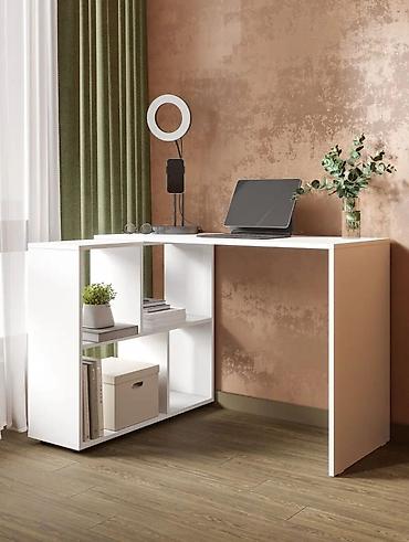 1) Угловой стол с открытым стеллажом на 4 секции: удобная L‑образная столешница, вертикальные и горизонтальные ниши для папок, книг, коробов и техники.