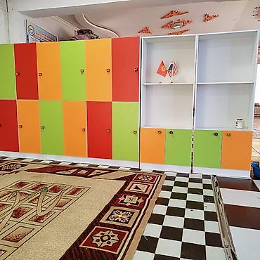 - Модульные шкафы/стеллажи для хранения: комбинированные фасады в ярких цветах (оранжевый, красный, зелёный), секции с дверцами и открытыми нишами.