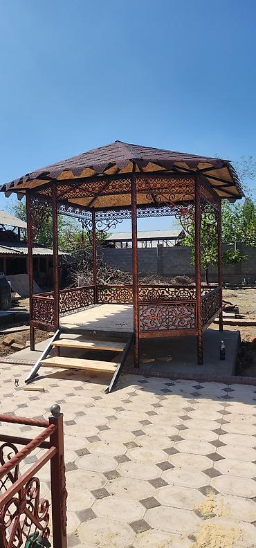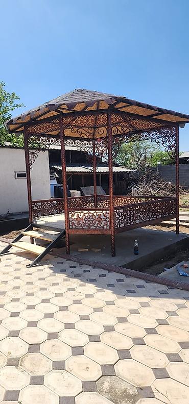 Металлический тапчан/беседка с крышей.и ворота навесы ферма куруу кызматы. - Каркас: профильная сталь, усиленные стойки и перемычки. - Крыша: четырехскатная, из металлических листов на обрешетке; ...