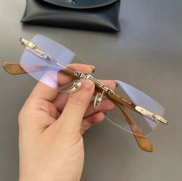 Безободковые очки с прямоугольными линзами и винтовой крепёжной системой.