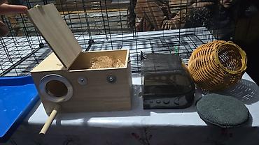 - Подвесные игрушки и аксессуары: разноцветные бусины‑мостики/качели, лестница, минеральные/абразивные диски для стачивания клюва и когтей.
