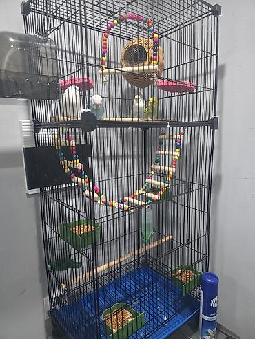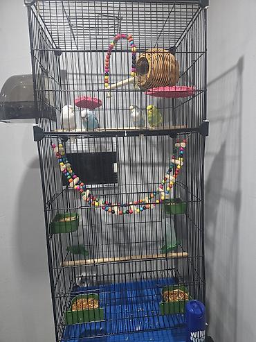 Большая многоуровневая клетка для волнистых попугаев и других мелких птиц с полным набором аксессуаров.