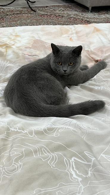 Британская короткошёрстная кошка, окрас сплошной серый (blue). Особенности: - Крупная круглая голова, выраженные щёки, широкие уши. - Плотная плюшевая шерсть однородного серого цвета. - Жёлто‑мед...