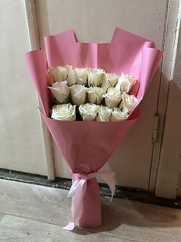 - Композиция: плотная шапка из белых роз (около 15–17 бутонов на коротких стеблях)