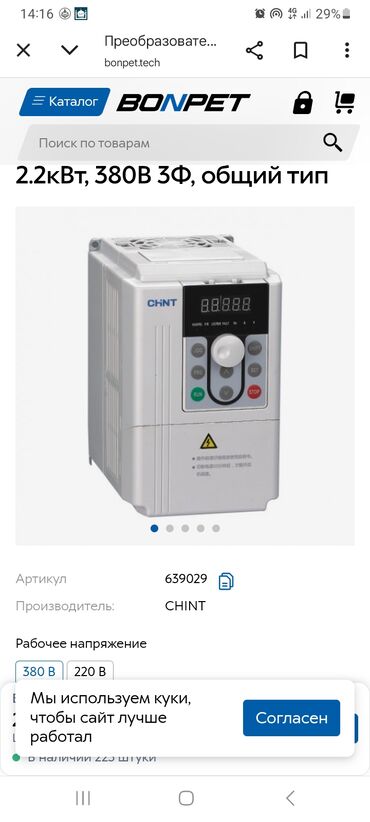 Дополнительно на скриншоте приведен пример аналогичного устройства CHINT: 2.2 кВт, 380 В, 3 фазы, общий тип (артикул 639029, производитель CHINT, рабочее напряжение 380 В/220 В — по выбору). Скриншот иллюстративный для понимания класса оборудования.