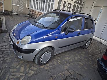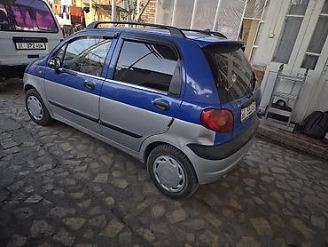 Chevrolet Matiz, 5‑дверный хэтчбек, синее/серебристое двухцветное окрашивание. Компактный городской автомобиль с экономичным бензиновым двигателем и механической коробкой передач.