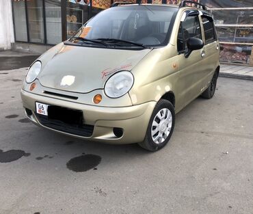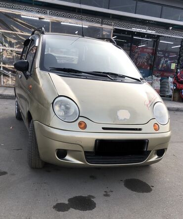Автомобиль Daewoo Matiz бежевый цвета, компактный хэтчбек с пятью дверями. Оснащен рейлингами на крыше для перевозки дополнительного багажа. Имеет литые диски с черными