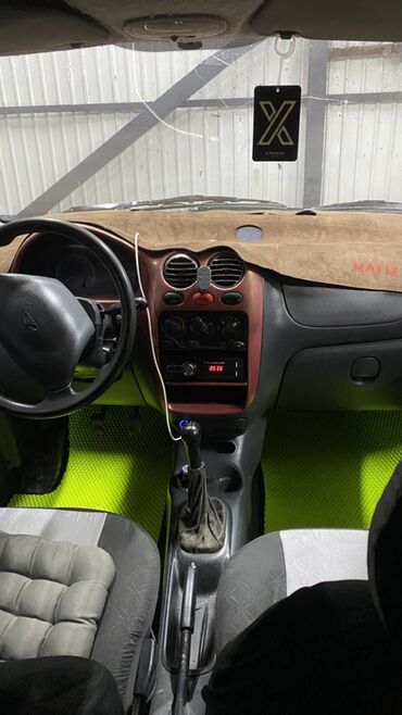 - Интерьер: темная панель с декоративными вставками, чехол на торпедо с надписью Matiz, неоново‑зеленые коврики, передние электростеклоподъемники (по кнопкам на торпедо), прикуриватель/розетка, подстаканники.