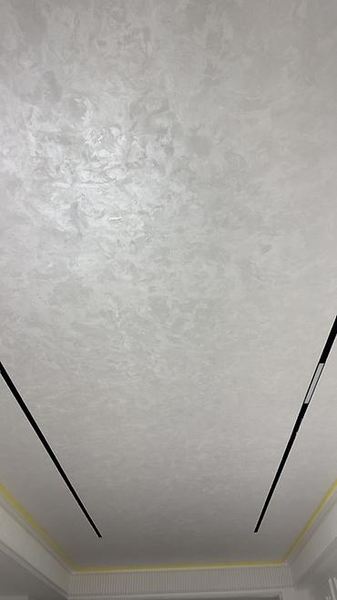 - Фактурная декоративная штукатурка на потолках и стенах: мягкий перламутровый эффект, деликатные переливы, бесшовная поверхность.