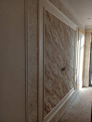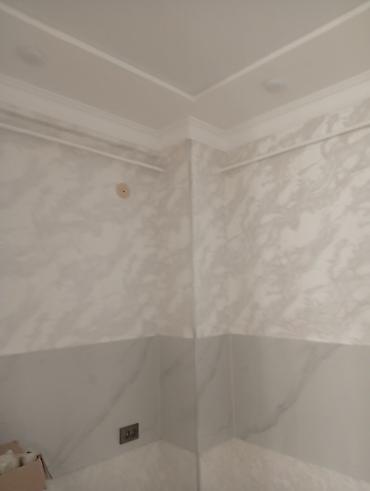- Материал: стеновые панели с мраморной фактурой, глянцевое покрытие; декоративные багеты/молдинги и карнизы из полиуретана/МДФ, окраска в белый.