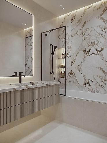 - Для ванных и санузлов доступна система облицовки с интеграцией ниш, светодиодной подсветки и черной фурнитуры, совместимая с пространствами душевой/ванны.