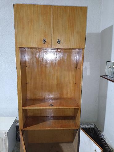 Деревянный шкаф для хранения вещей. Модель включает верхнее отделение с двумя дверцами, открытую нишу с полками и нижнее отделение с двумя дверцами. Такой шкаф может использоваться для организации пространства в различных помещениях.