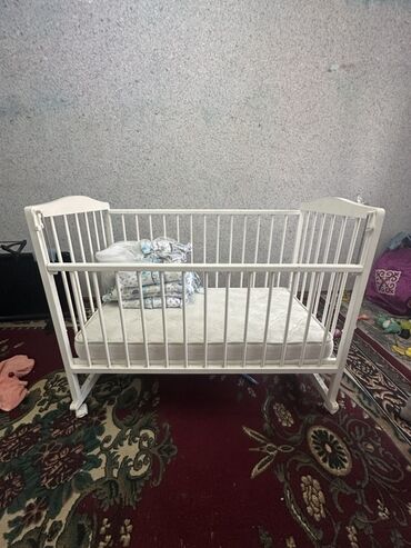 - Классическая деревянная кроватка белого цвета с реечными бортиками и изголовьем.