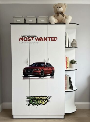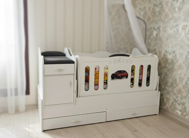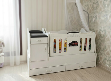 Многофункциональная детская кроватка-трансформер белого цвета, предназначенная для комфортного сна и развития ребенка. Модель оснащена встроенными ящиками для хранения белья или игрушек и приставной тумбой с полками и пеленальным столиком, который может трансформироваться в дополнительную полку или стол. Кроватка украшена надписью «BABY» и изображением гоночной машины, что делает ее привлекательной для ребенка. Боковая стенка кроватки имеет реечную конструкцию для безопасности и вентиляции. Это практичное решение для детской комнаты, позволяющее эффективно использовать пространство.