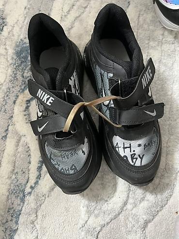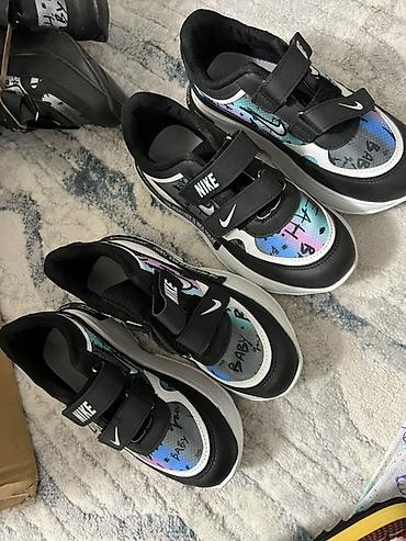 - Кроссовки с липучками Nike: черно‑белая основа, разноцветные вставки с графичным принтом, двойные ремешки‑липучки, амортизирующая подошва, логотипы на язычке и по бокам.