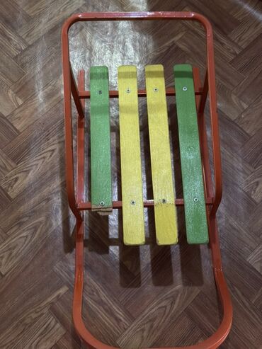 Детские санки с металлической рамой и деревянным сиденьем. -