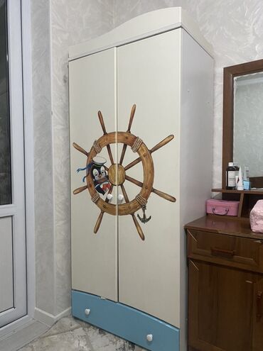 - Шкаф двухдверный с декоративным штурвалом на фасаде. Внизу — выдвижной ящик на белых ручках-пуговках, цоколь нежно-голубого цвета. Корпус светлый, верхняя панель с фигурным кантом. Дверцы на петлях, удобные круглые ручки.