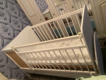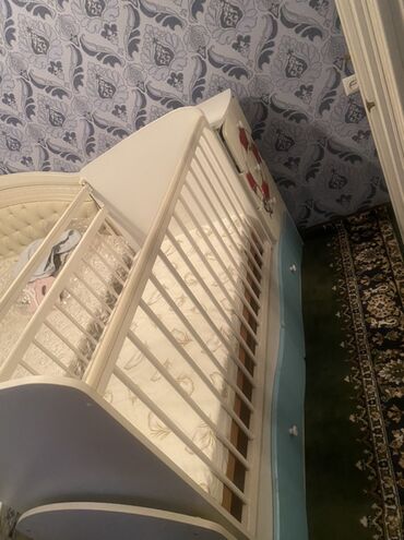 - Детская кроватка-качалка/люлька с реечными боковинами, светлого цвета. Один из бортов опускается на направляющих фиксаторах. В основании предусмотрен продольный выкатной ящик голубого цвета с двумя ручками. На торце — декоративный спасательный круг. В комплекте матрас.