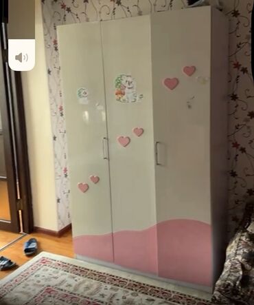 - Трехдверный шкаф для одежды: две ручки на каждой створке, комбинированная окраска с розовой волной снизу, декоративные сердечки.