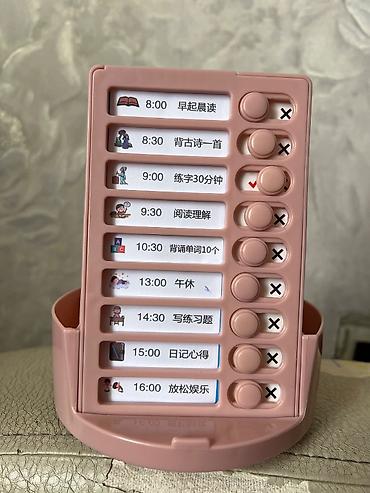 - Съемная вертикальная панель-планер: 8 ячеек с временными слотами и заданиями (на китайском), рядом механические ползунки с отметками «галочка/крестик» — удобно отмечать выполненные дела.