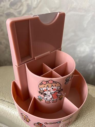 - Компактный розовый органайзер для рабочего стола с милыми рисунками.