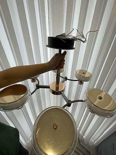 - Современный минималистичный дизайн: черно-золотистая арматура, матовые дисковые плафоны с прозрачным кантом.