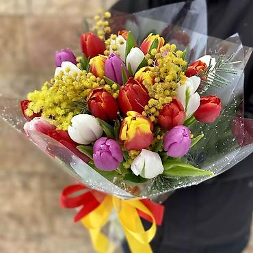 • Пышный букет-микс тюльпанов с веточками мимозы в прозрачной плёнке с двойной лентой.