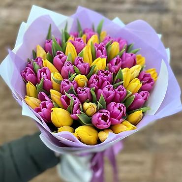 - Ассортимент: однотонные и микс-букеты тюльпанов, варианты с мимозой и зеленью.
