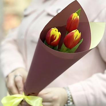 • Мини-букет из 3 тюльпанов в крафт-упаковке с лентой.