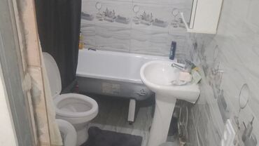 - Санузел совмещенный: ванна стандартного размера, унитаз, раковина на пьедестале, настенный шкафчик с зеркалом, облицовка плиткой.